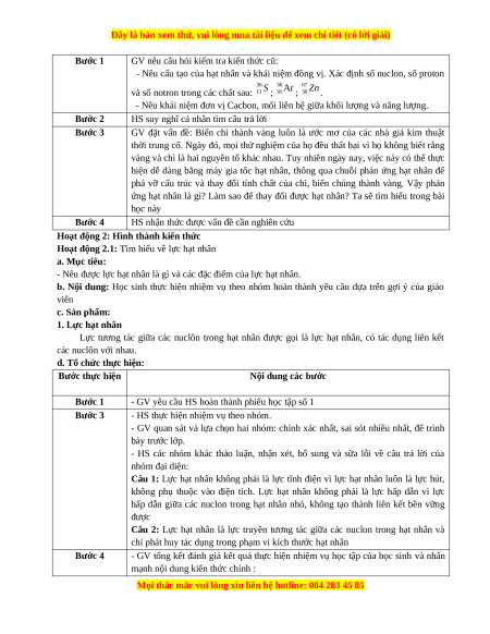 b. Nội dung: Học sinh thực hiện nhiệm vụ theo nhóm hoàn thành yêu cầu dựa trên gợi ý của giáo viên c. Sản phẩm: 1. Lực hạt nhân