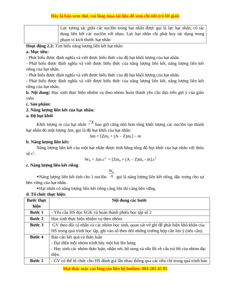 Hoạt động 2.2: Tìm hiểu năng lượng liên kết hạt nhân a. Mục tiêu: