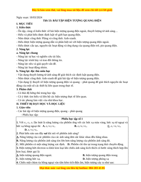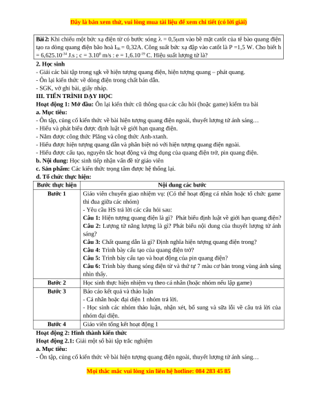 - Ôn tập, củng cố kiến thức về bài hiện tượng quang điện ngoài, thuyết lượng tử ánh sáng…