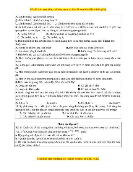 5.Lần lượt chiếu hai bức xạ có bước sóng λ1 = 0,75μm, λ2 = 0,25μm vào một tấm kẽm có giới hạn