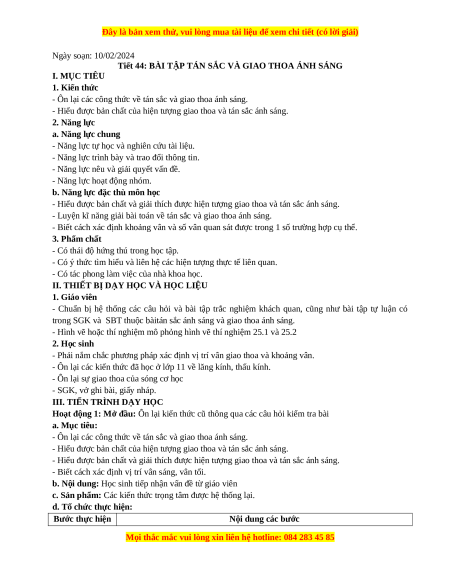 Tiết 44: BÀI TẬP TÁN SẮC VÀ GIAO THOA ÁNH SÁNG