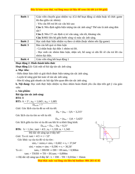Hoạt động 2.1: Giải một số bài tập tán sắc ánh sáng a. Mục tiêu: