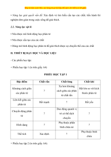 + Phiếu học tập 1 (in trên giấy A4) PHIẾU HỌC TẬP 1 Đặc điểm Chất rắn Chất lỏng Chất khí Xa hơn khoảng Khoảng cách giữa Rất lớn so với kích ? cách giữa các phân các phân tử thước phân tử tử chất rắn Liên kết giữa các Rất mạnh ? Rất yếu phân tử Dao động quanh vị Chuyển động phân ? trí có thể dịch ? tử chuyển Phụ thuộc phần Hình dạng ? ? bình chứa nó Phụ thuộc bình Thể tích Xác định ? chứa