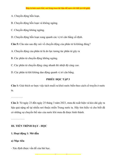 Câu 2: Chuyển động nào sau đây là chuyển động của riêng các phân tử ở thể lỏng?