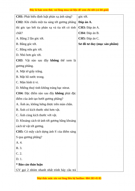 thì góc tạo bởi tia phản xạ và tia tới có tính CH3: Đáp án A. chất? CH4: Đáp án B. A. Bằng 2 lần góc tới. CH5: Đáp án C. B. Bằng góc tới.
