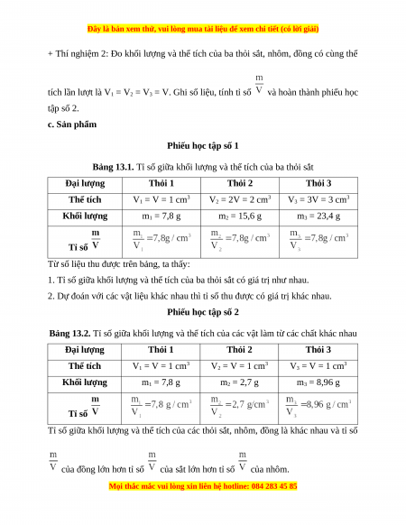 Bảng 13.2. Tỉ số giữa khối lượng và thể tích của các vật làm từ các chất khác nhau Đại lượng Thỏi 1 Thỏi 2 Thỏi 3 Thể tích V1 = V = 1 cm3 V2 = V = 1 cm3 V3 = V = 1 cm3 Khối lượng m1 = 7,8 g m2 = 2,7 g m3 = 8,96 g Tỉ số