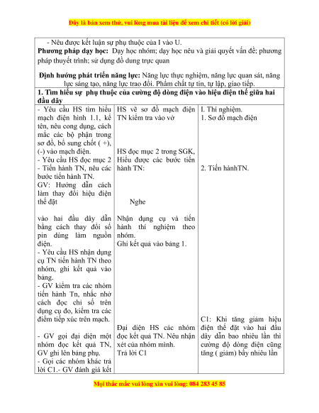 BÀI:1 SỰ PHỤ THUỘC CỦA CƯỜNG ĐỘ DÒNG ĐIỆN