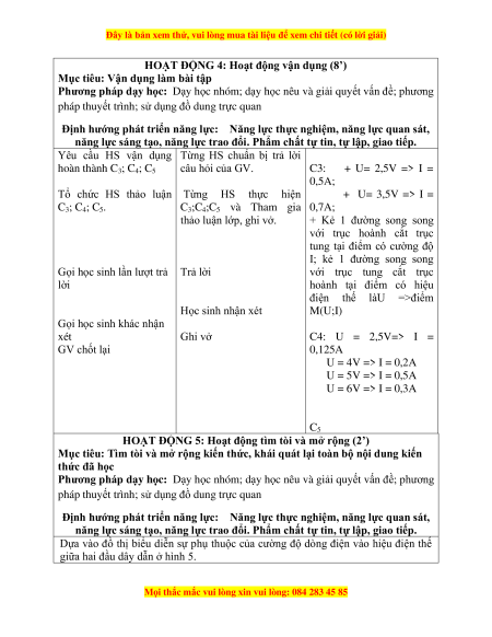 Yêu cầu HS vận dụng Từng HS chuẩn bị trả lời hoàn thành C câu hỏi của GV. 3; C4; C5 C3: + U= 2,5V => I = 0,5A;