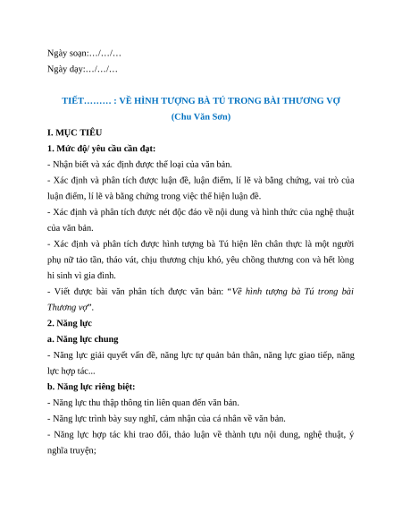TIẾT……… : VỀ HÌNH TƯỢNG BÀ TÚ TRONG BÀI THƯƠNG VỢ (Chu Văn Sơn) I. MỤC TIÊU