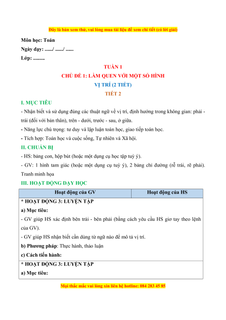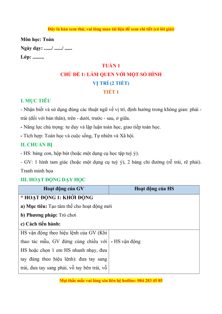 CHỦ ĐỀ 1: LÀM QUEN VỚI MỘT SỐ HÌNH VỊ TRÍ (2 TIẾT) TIẾT 1 I. MỤC TIÊU