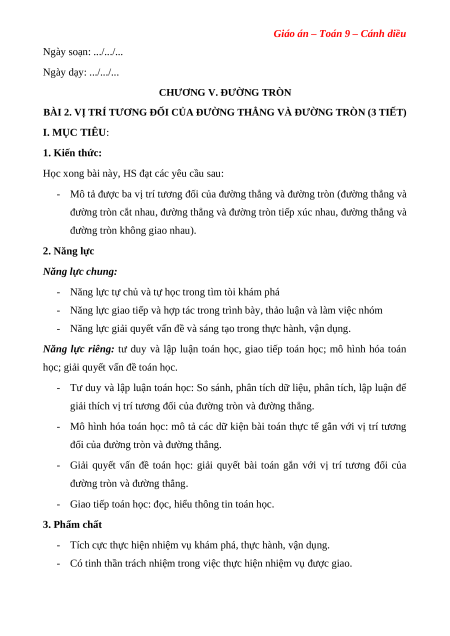 Giáo án – Toán 9 – Cánh diều Ngày soạn: .../.../... Ngày dạy: .../.../...