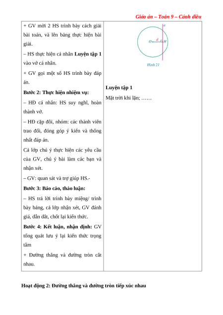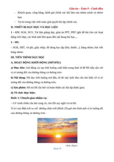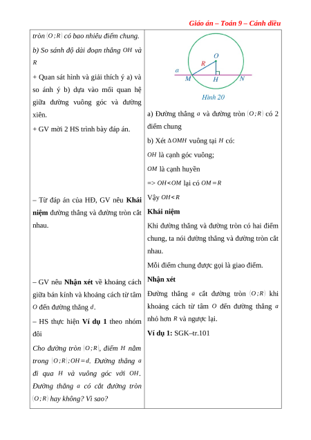Giáo án Vị trí tương đối của đường thẳng và đường tròn Toán 9 Cánh diều
