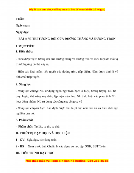 BÀI 4: VỊ TRÍ TƯƠNG ĐỐI CỦA ĐƯỜNG THẲNG VÀ ĐƯỜNG TRÒN I. MỤC TIÊU: 1. Kiến thức: