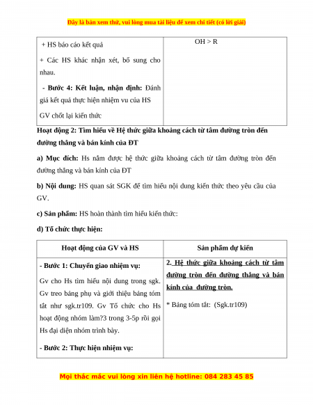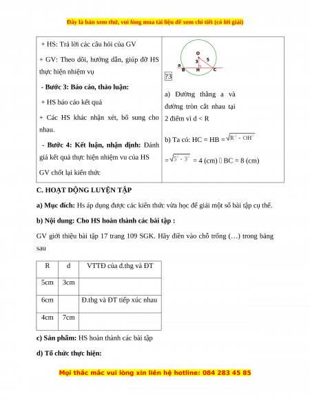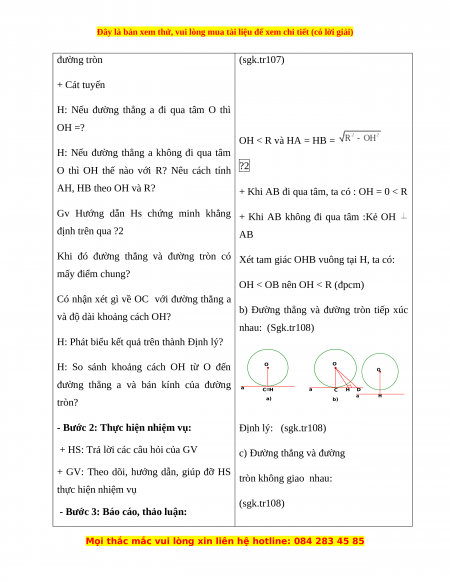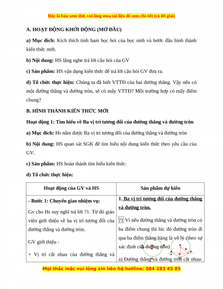 Giáo án Vị trí tương đối của đường thẳng và đường tròn Toán 9 Học kì 1
