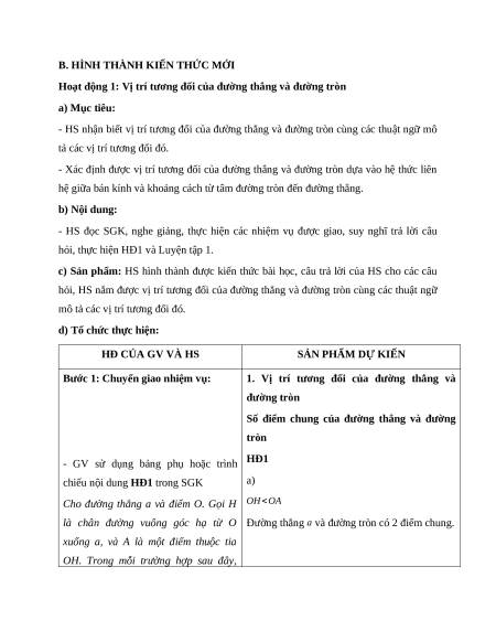 Hoạt động 1: Vị trí tương đối của đường thẳng và đường tròn a) Mục tiêu: