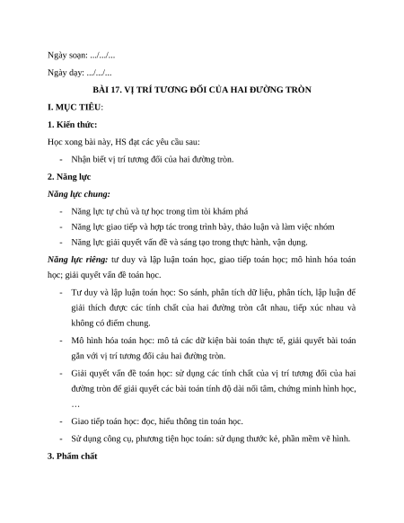 BÀI 17. VỊ TRÍ TƯƠNG ĐỐI CỦA HAI ĐƯỜNG TRÒN I. MỤC TIÊU: