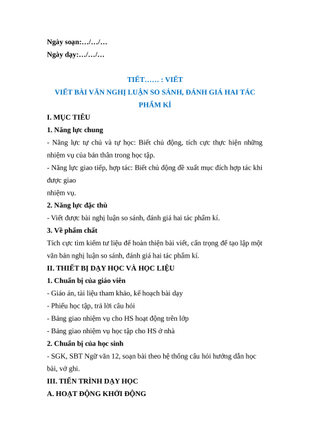 VIẾT BÀI VĂN NGHỊ LUẬN SO SÁNH, ĐÁNH GIÁ HAI TÁC PHẨM KÍ I. MỤC TIÊU 1. Năng lực chung
