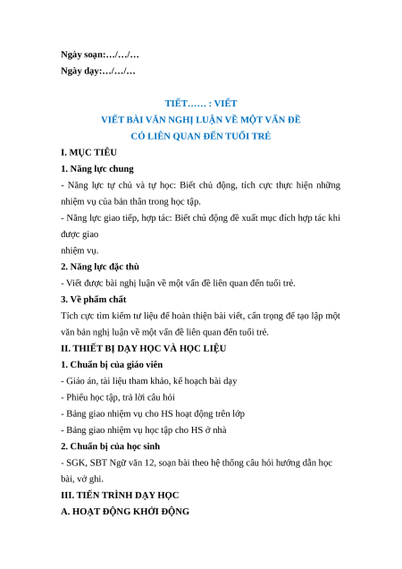 Giáo án Viết bài nghị luận về một vấn đề có liên quan đến tuổi trẻ Ngữ Văn 12 Cánh diều