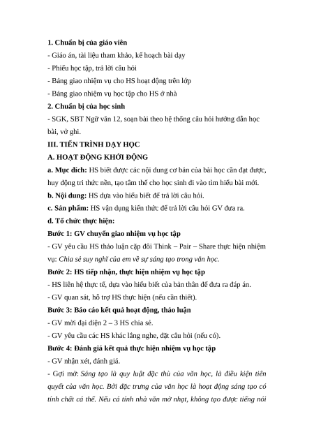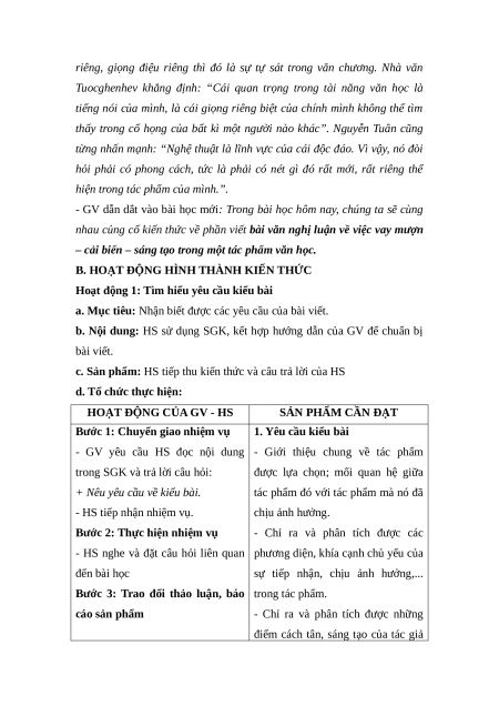 SÁNG TẠO TRONG MỘT TÁC PHẨM VĂN HỌC I. MỤC TIÊU 1. Năng lực chung