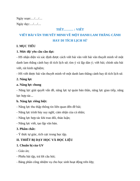 - HS viết được bài văn thuyết minh về một danh lam thắng cảnh hay di tích lịch sử. 2. Năng lực a. Năng lực chung