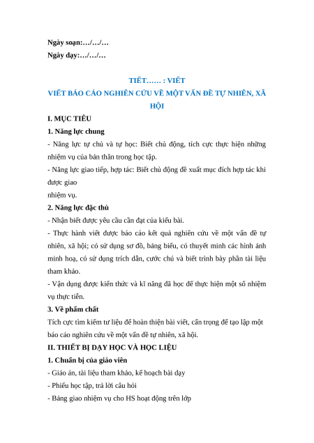 VIẾT BÁO CÁO NGHIÊN CỨU VỀ MỘT VẤN ĐỀ TỰ NHIÊN, XÃ HỘI I. MỤC TIÊU 1. Năng lực chung