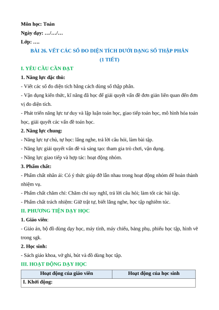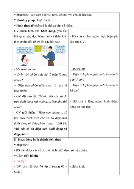 BÀI 26. VẾT CÁC SỐ ĐO DIỆN TÍCH DƯỚI DẠNG SỐ THẬP PHÂN (1 TIẾT)