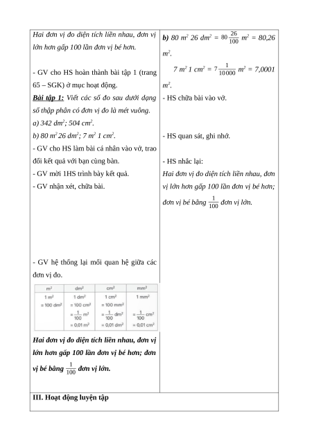 - GV nhận xét, tuyên dương HS. 342 a) 342 dm2 = m2 = 3,42 m2. 100 504 - GV lưu ý cho HS: 504 cm2 = m2 = 0,0504 m2. 10 000