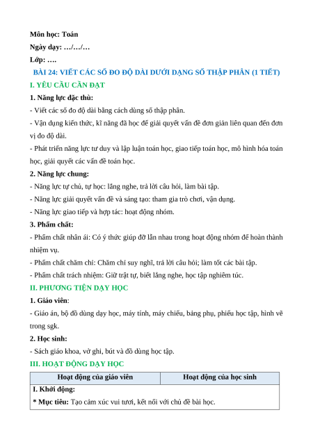 BÀI 24: VIẾT CÁC SỐ ĐO ĐỘ DÀI DƯỚI DẠNG SỐ THẬP PHÂN (1 TIẾT)