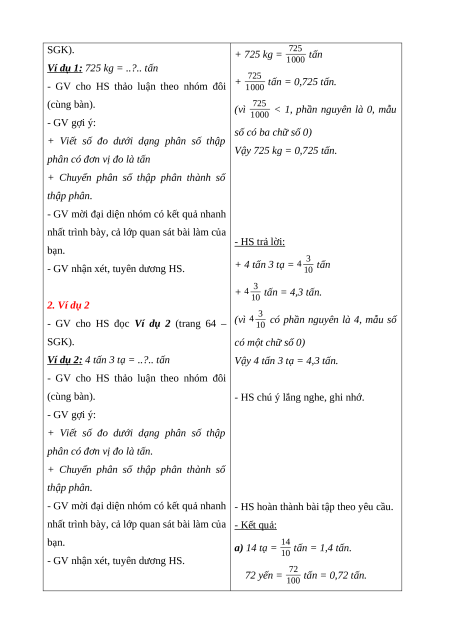 + Viết số đo dưới dạng phân số thập Vậy 725 kg = 0,725 tấn.