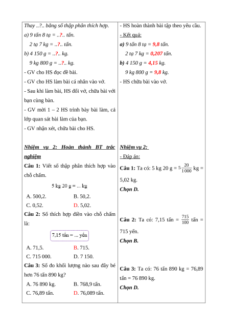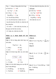 - GV nhận xét, tuyên dương HS. 72 72 yến = tấn = 0,72 tấn. 100 - GV lưu ý cho HS: 5 5 kg = tấn = 0,005 tấn. 1000