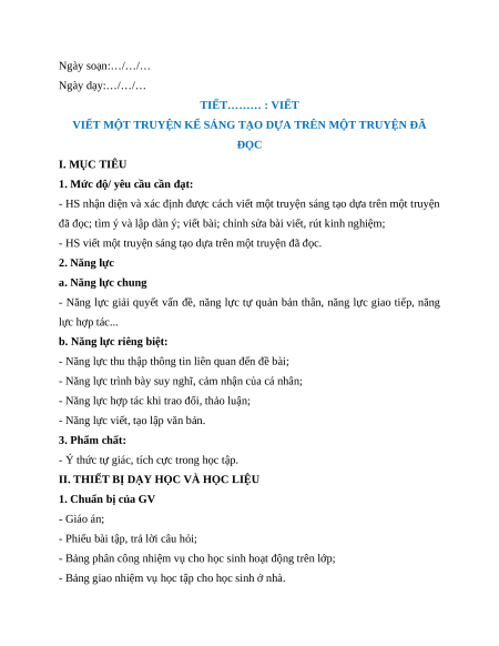 Giáo án Viết một truyện kể sáng tạo dựa trên một truyện đã đọc Ngữ Văn 9 Chân trời sáng tạo