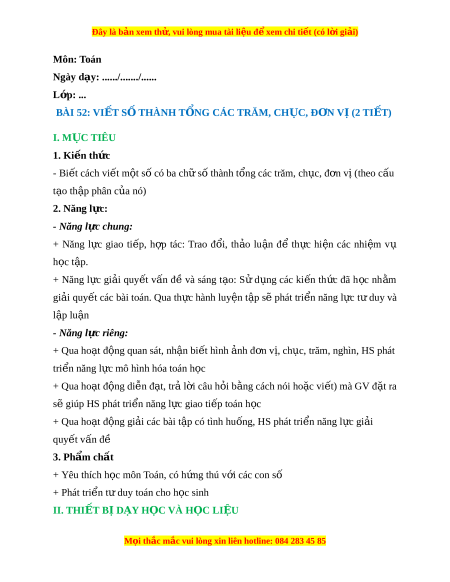Ngày dạy: ....../......./...... L p: ớ ... BÀI 52: VI T Ế S Ố THÀNH T N Ổ G CÁC TRĂM, CH C Ụ , Đ N Ơ V ( Ị 2 TI T Ế ) I. M C Ụ TIÊU 1. Ki n t ế h c ứ - Bi t ế cách vi t ế m t