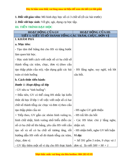 ớ giáo viên: Mô hình d y h ụ c s ọ ố có 3 ch s ữ ( ố các bài ở trư c) ớ 2. Đ i ố v i ớ h c s ọ inh: V ghi ở , sgk, d ng c ụ h ụ c t ọ p. ậ III. TI N Ế TRÌNH D Y Ạ H C Ọ HOẠT Đ N Ộ G C A Ủ GV HOẠT Đ N Ộ G C A Ủ HS TI T Ế 1: VI T Ế T S Ỉ Ố THÀNH T N Ổ G CÁC TRĂM, CH C Ụ , Đ N Ơ V Ị I. KHÁM PHÁ a. Mục tiêu: - T o ạ tâm thế h ng ứ thú cho HS và t ng ừ bư c ớ làm quen bài h c. ọ - H c ọ sinh bi t ế cách vi t ế m t ộ số có ba ch ữ số