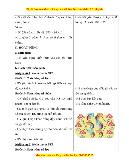 + Số 591 gồm .... Ta vi t ế 500 + 90 + 1 +..... g m ồ 2 trăm, 7 ch c ụ và 0 đ n ơ vị . Ta vi t ế :... II. HOẠT Đ N Ộ G a. Mục tiêu: - HS v n ậ d ng ụ ki n ế th c ứ vào các bài th c ự hành b. Cách th c ứ ti n hàn ế h Nhi m ệ v 1