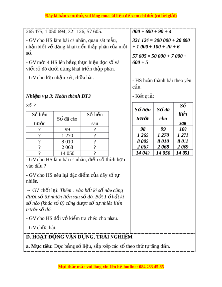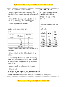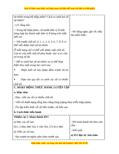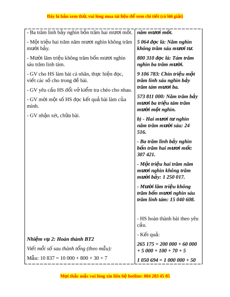 ắ so sánh các số có nhi u ề ch s ữ ố. C. HOẠT Đ N Ộ G TH C Ự HÀNH, LUY N Ệ T P Ậ a. Mục tiêu: - Đ c, ọ vi t ế các số có nhi u ch ề s ữ ố. - Vi t ế số dư i ớ d ng ạ tổng theo t ng hàng ( ừ d ng ạ khai tri n t ể h p ậ phân). - Ôn t p ậ ki n t ế h c v ứ s ề ố li n ề trư c, ớ s l ố i n s ề au. b. Cách th c t ứ i n hành ế Nhi m ệ v 1