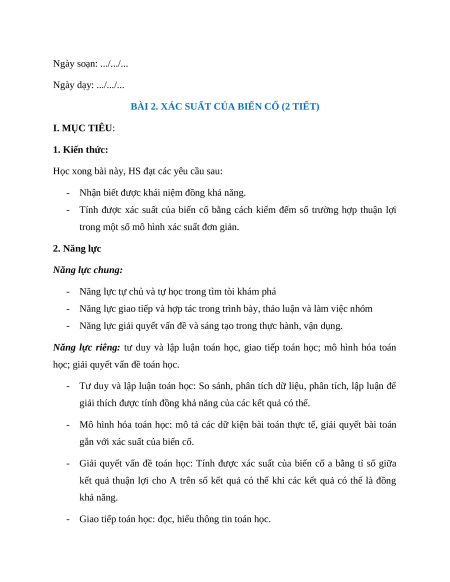 BÀI 2. XÁC SUẤT CỦA BIẾN CỐ (2 TIẾT) I. MỤC TIÊU: