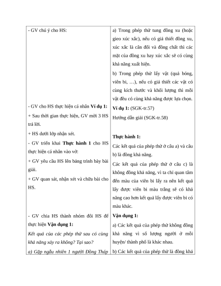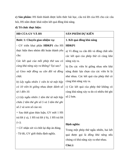 - HS nắm được khái niệm kết quả đồng khả năng trong một phép thử ngẫu nhiên. b) Nội dung: