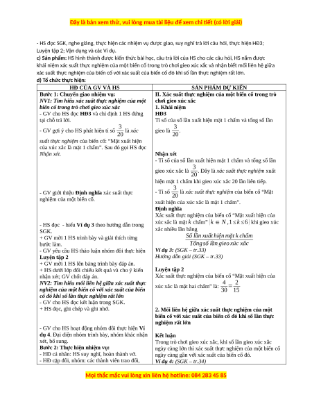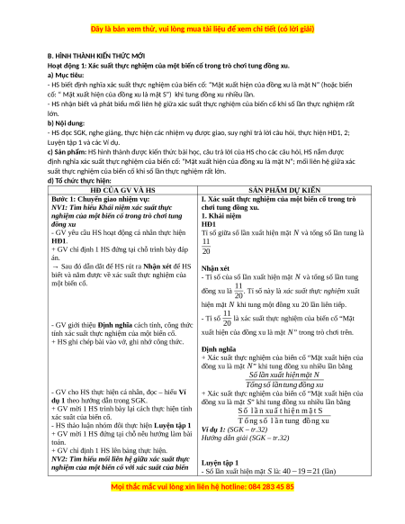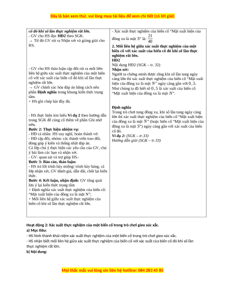 - HS nhận biết và phát biểu mối liên hệ giữa xác suất thực nghiệm của biến cố khi số lần thực nghiệm rất lớn. b) Nội dung:
