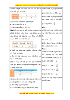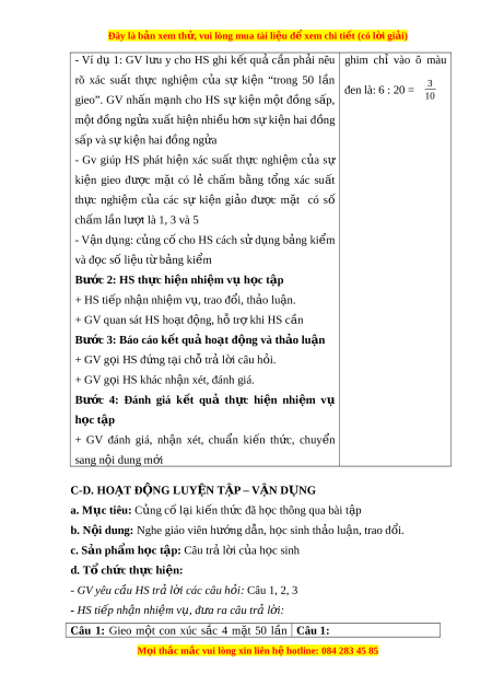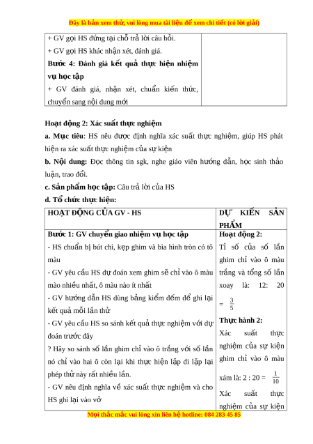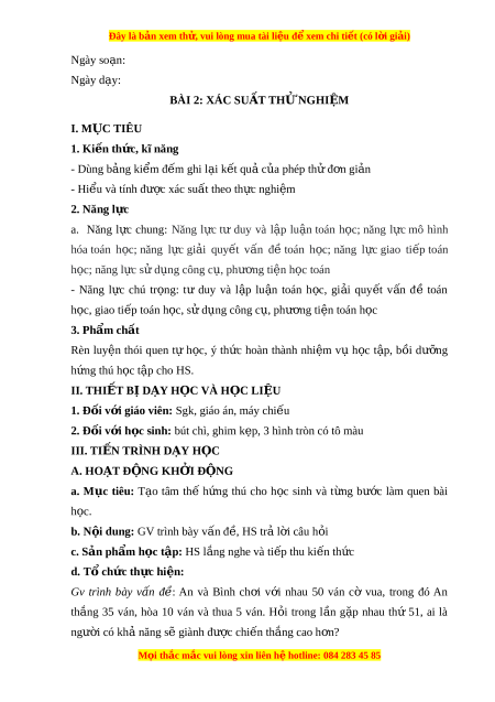 Đây là bản xem th , vu ử i lòng mua tài li u ệ đ xe ể m chi ti t ế (có l i ờ gi i ả ) Ngày so n: ạ Ngày d y: ạ BÀI 2: XÁC SU T Ấ TH N Ử GHI M Ệ I. M C Ụ TIÊU 1. Ki n t ế h c, kĩ ứ năng - Dùng b ng ả ki m ể đ m ế ghi l i ạ k t ế qu c ả a phép ủ th đ ử n gi ơ n ả - Hi u ể và tính đư c xác s ợ uất theo th c nghi ự m ệ 2. Năng l c ự a. Năng l c ự chung: Năng l c ự tư duy và l p ậ lu n ậ toán h c; ọ năng l c ự mô hình hóa toán h c; ọ năng l c ự gi i ả quy t ế v n ấ đề toán h c; ọ năng l c ự giao ti p ế toán h c; ọ năng l c ự s d ử ng ụ công c , ph ụ ư ng ơ ti n ệ h c ọ toán - Năng l c ự chú tr ng: ọ tư duy và l p ậ lu n ậ toán h c, ọ gi i ả quy t ế v n ấ đề toán h c, gi ọ ao ti p t ế oán h c, ọ s d ử ng ụ công c , ph ụ ư ng ơ ti n t ệ oán h c ọ 3. Ph m ẩ chất Rèn luy n ệ thói quen tự h c, ọ ý th c ứ hoàn thành nhi m ệ vụ h c ọ t p, ậ b i ồ dư ng ỡ h ng t ứ hú h c t ọ p ậ cho HS.