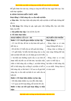 ọ đề bài và đự đoán k t ế quả có - Bóng ch n ọ ra có màu th x ể y r ả a vàng: Không th x ể y ả ra - HS tr l ả i ờ , GV bi u t ể h các k ị t ế qu t ả rên b ng ả - Bóng ch n ọ ra không có - GV gi i ớ thi u: ệ Ta bi u ể thị khả năng x y ả ra c a ủ màu vàng: Không thể x y ả m t ộ sự ki n ệ b i ở m t ộ con s ố nh n ậ giá tr ịt ừ 0 đ n ế ra 1. Sự ki n ệ nào thư ng ờ xuyên x y ả ra cao h n ơ sẽ - Bóng ch n ọ ra có màu đư c ợ bi u ể thị b i ở con số l n ớ h n. ơ Sự ki n ệ ch c ắ xanh: Có th x ể y ả ra ch n ắ có khả năng x y ả ra b ng ằ 1, sự ki n ệ không Sự ki n ệ có khả năng x y ả thể có khả năng x y ả ra b ng ằ 0, s ự ki n ệ có th ể có ra cao nh t ấ : Bóng ch n ọ ra khả năng x y ả ra l n ớ h n ơ 0. Về sau ta s ẽ g i ọ khả có màu xanh năng x y ả ra c a ủ m t ộ sự ki n ệ là xác su t ấ c a ủ sự kiện đó Bư c ớ 2: HS th c hi ự n nhi ệ m ệ v h ụ c t ọ p ậ + HS ti p ế nh n nhi ậ m ệ v , t ụ rao đ i ổ , th o ả lu n. ậ + GV quan sát HS ho t ạ đ ng, ộ h t ỗ r khi ợ HS c n ầ Bư c ớ 3: Báo cáo k t ế quả ho t ạ đ ng ộ và th o ả luận M i ọ thắc m c