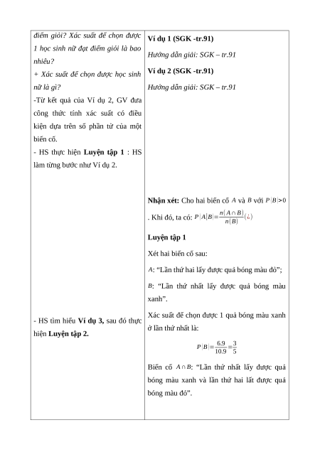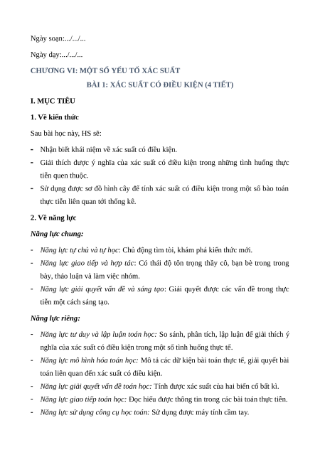 BÀI 1: XÁC SUẤT CÓ ĐIỀU KIỆN (4 TIẾT) I. MỤC TIÊU 1. Về kiến thức Sau bài học này, HS sẽ:
