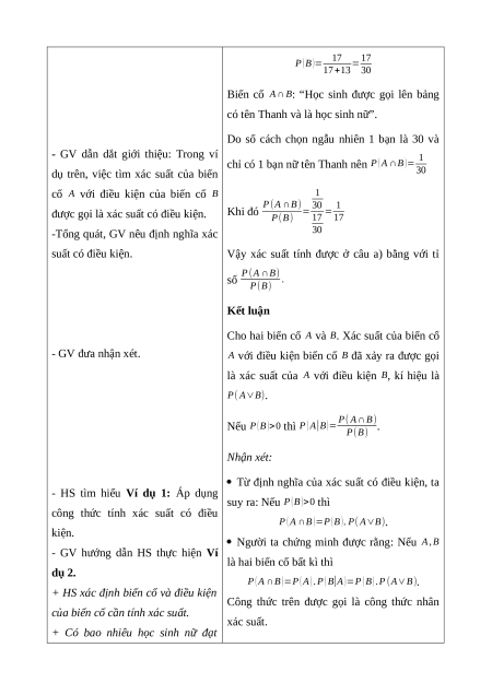-Tổng quát, GV nêu định nghĩa xác 30 suất có điều kiện.