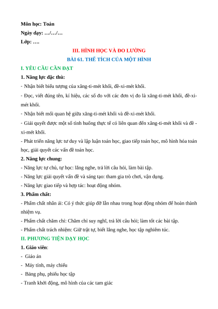BÀI 61. THỂ TÍCH CỦA MỘT HÌNH