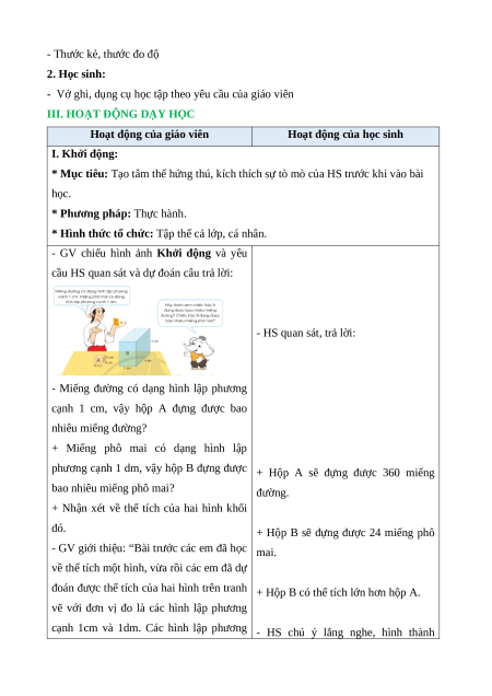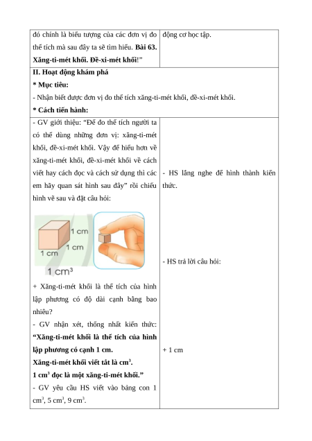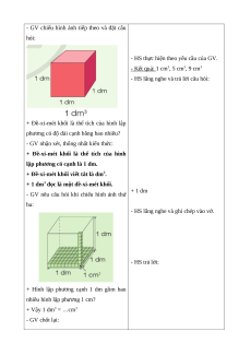 - Nhận biết được đơn vị đo thể tích xăng-ti-mét khối, đề-xi-mét khối. * Cách tiến hành: