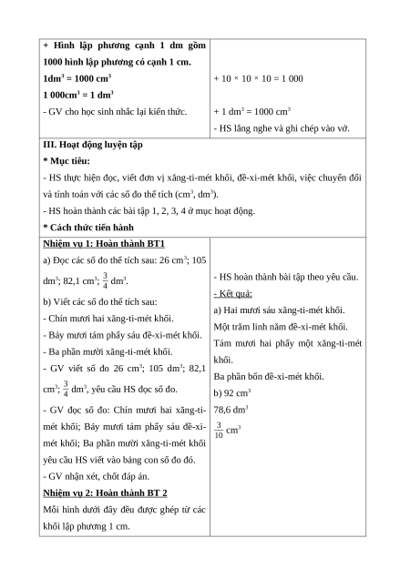 - Giải quyết được một số tình huống thực tế có liên quan đến xăng-ti-mét khối và đề - xi-mét khối.