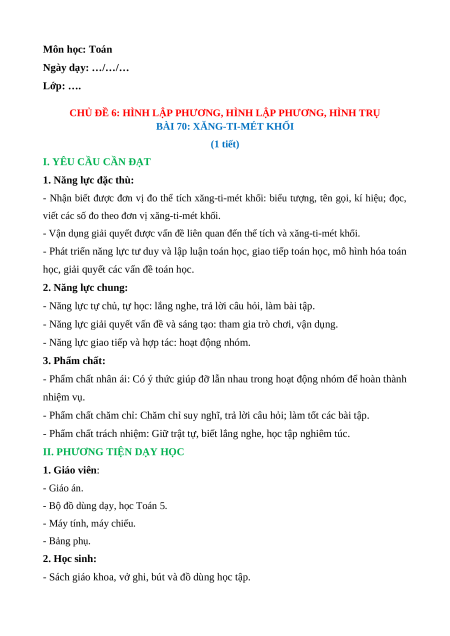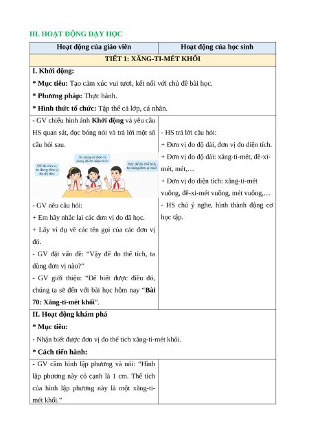BÀI 70: XĂNG-TI-MÉT KHỐI (1 tiết)