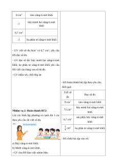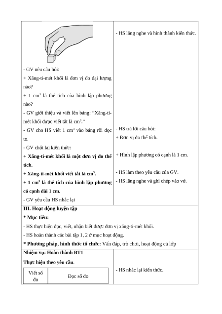 - HS thực hiện đọc, viết, nhận biết được đơn vị xăng-ti-mét khối.