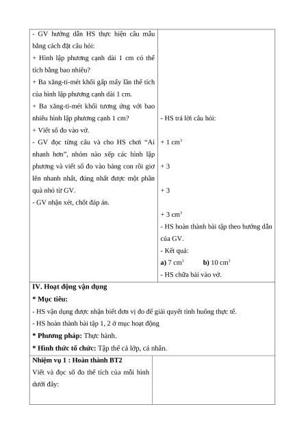 - Vận dụng giải quyết được vấn đề liên quan đến thể tích và xăng-ti-mét khối.