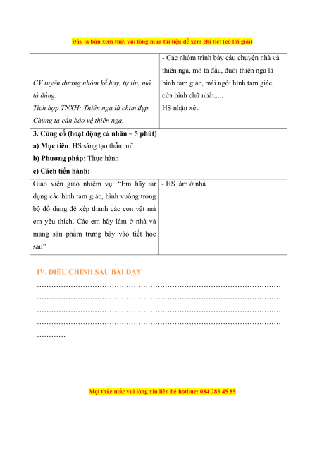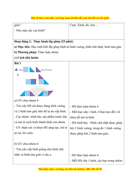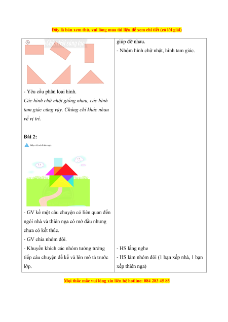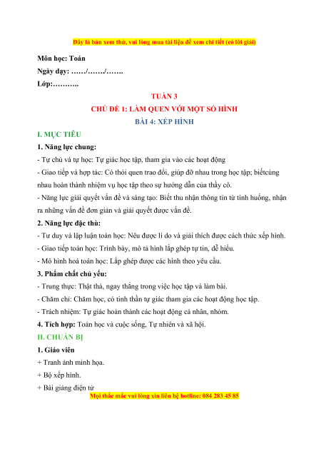 Đây là bản xem thử, vui lòng mua tài liệu để xem chi tiết (có lời giải) 2. Học sinh + Bộ xếp hình Toán. + Sách,vở, bút