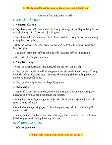 I. YÊU CẦU CẦN ĐẠT 1. Năng l c đ ự c t ặ hù: - Nh n bi ậ t ế được: Các đ n v ơ đo kh ị i ố lư ng: ợ y n, t ế , t ạ n; ấ m i ố quan h gi ệ a các ữ đ n ơ v y ị n, t ế , ạ t n và v ấ i ớ đ n v ơ ki ị -lô-gam. - Bi t ế chuy n ể đ i ổ và tính toán v i ớ các đ n v ơ đo kh ị i ố lư ng đã h ợ c ( ọ trong nh ng ữ trư ng h ờ p đ ợ n ơ gi n) ả . - Th c hi ự n đ ệ ư c ợ vi c ệ ước lư ng các ợ k t ế qu đo l ả ư ng ờ trong m t ộ số trư ng ờ h p ợ đ n gi ơ n. ả - Gi i ả quy t ế đư c ợ m t ộ s v ố n đ ấ t ề h c t ự i n l ễ iên quan đ n đo kh ế i ố lư ng. ợ - Phát tri n các ể năng l c t ự oán h c. ọ 2. Năng l c chung ự : - Năng l c t ự ch ự , ủ t h ự c: ọ l ng ắ nghe, tr l ả i ờ câu h i ỏ , làm bài t p. ậ - Năng l c gi ự i ả quy t ế v n đ ấ và s ề áng t o: ạ tham gia trò ch i ơ , v n d ậ ng, ụ sử d ng ụ các ki n t ế h c đã h ứ c ọ ng d ứ ng vào t ụ h c t ự , ế tìm tòi, phát hi n gi ệ i ả quy t ế các nhiệm v t ụ rong cu c s ộ ống. - Năng l c gi ự ao ti p và ế h p t ợ ác: ho t ạ đ ng ộ nhóm. 3. Phẩm ch t ấ : - Chăm ch : ỉ Chăm h c, ham ọ h c, ọ có tinh th n t ầ h ự c; ọ ch u khó đ ị c s ọ ách giáo khoa, tài li u và t ệ h c ự hi n các ệ nhi m ệ vụ cá nhân. - Trung th c: ự trung th c t ự rong th c hi ự n gi ệ i ả bài t p, ậ th c hi ự n nhi ệ m ệ v , ụ ghi chép và rút ra k t ế lu n. ậ - Yêu thích môn h c, s ọ áng t o, có ạ ni m ề h ng t ứ hú, say mê các con s đ ố gi ể i ả quy t ế bài toán. - Rèn luy n t ệ ính c n t ẩ h n, chí ậ nh xác, phát huy ý th c ch ứ đ ủ ng, ộ trách nhi m ệ và bồi dư ng s ỡ ự t t ự in, h ng t ứ hú trong vi c h ệ c. ọ II. Đ D Ồ ÙNG D Y Ạ H C Ọ 1. Đ i ố v i ớ giáo viên M i